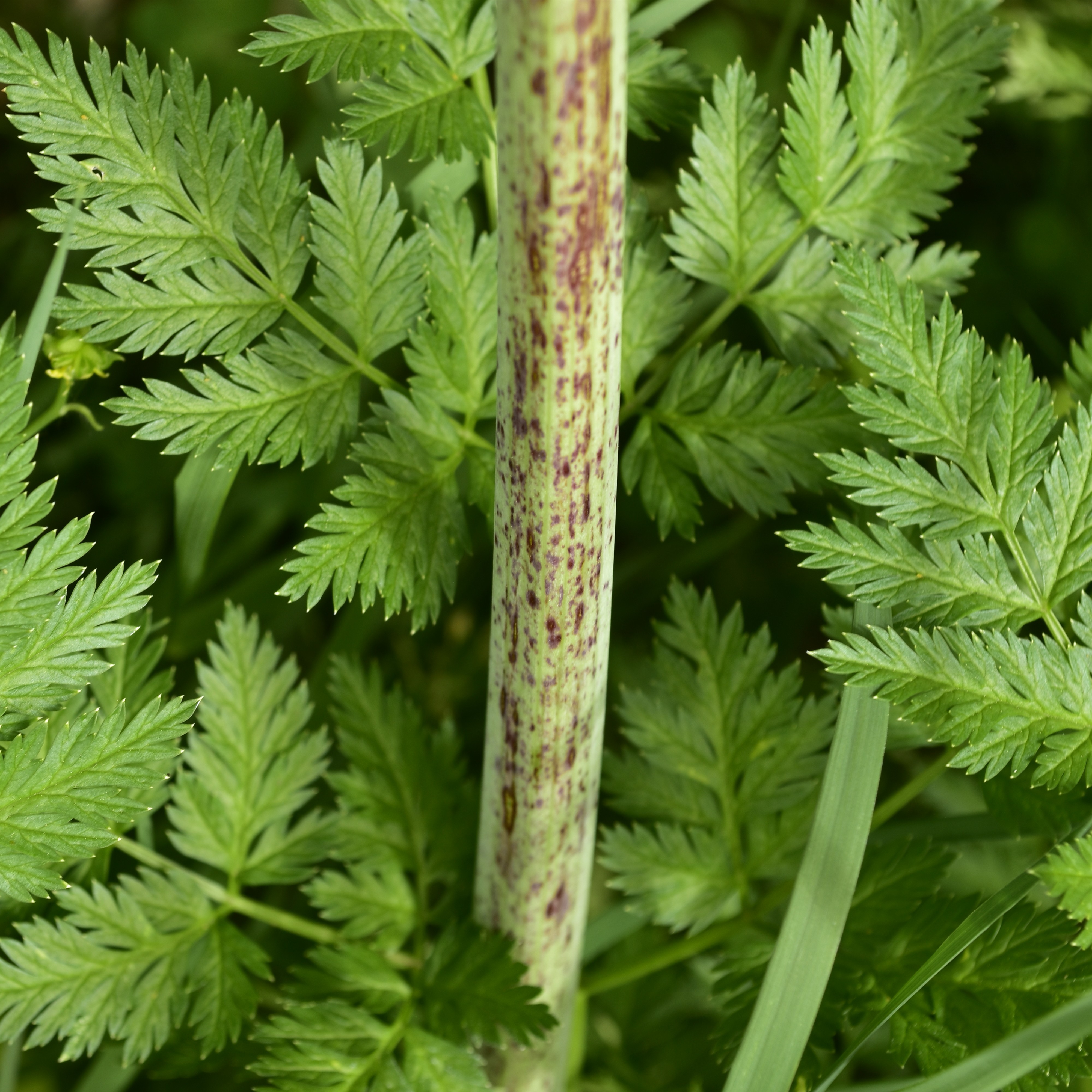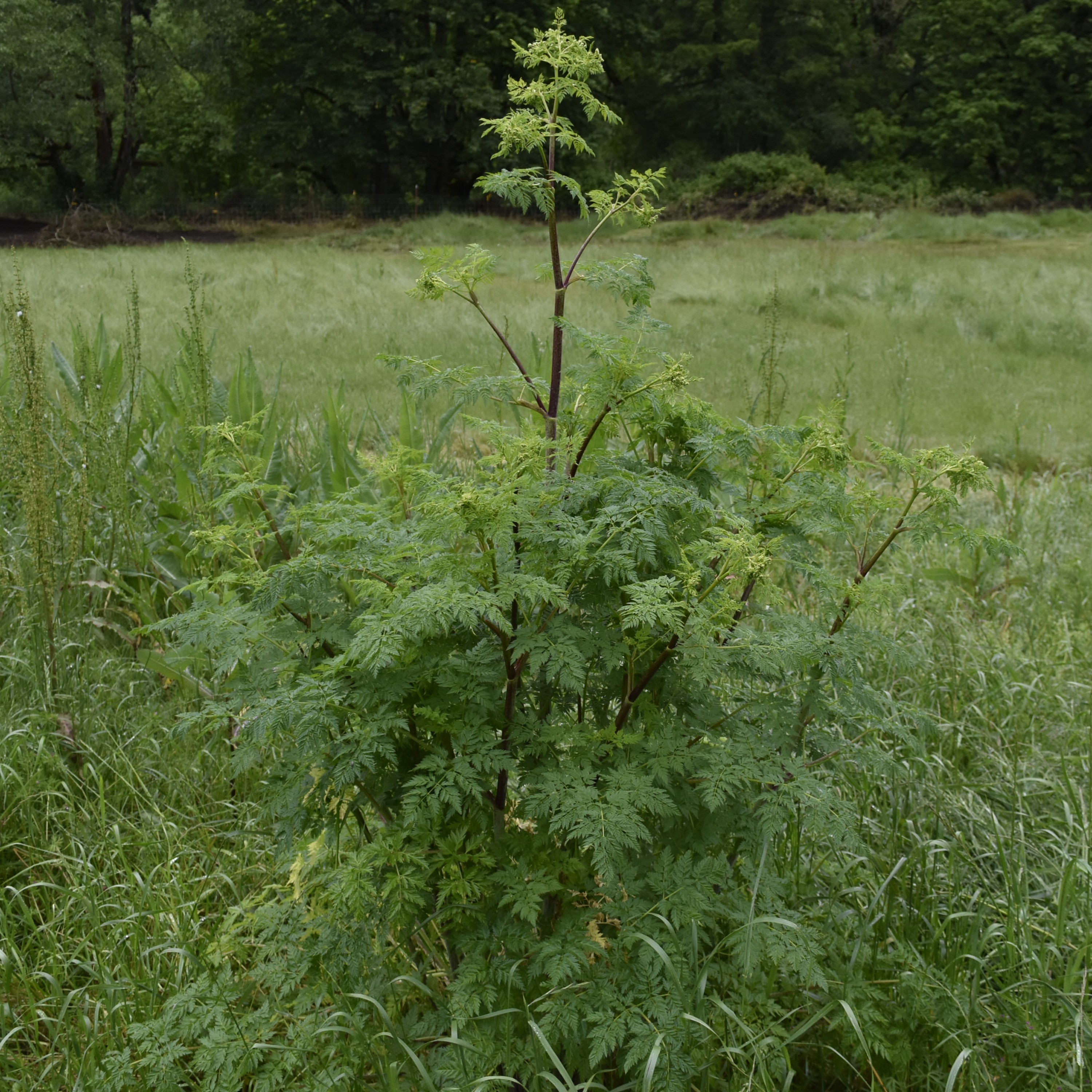 Difference: ☠️ Poison Hemlock grows comparably taller (5-8ft on average but can grow even taller), it has a completely hairless stem, speckled with reddish/purple streaks and blotches, and is often covered in a white, powdery film. Its flowering season completes earlier in the year with the stem detritus/seeds still persisting into winter months. Odor is musty.