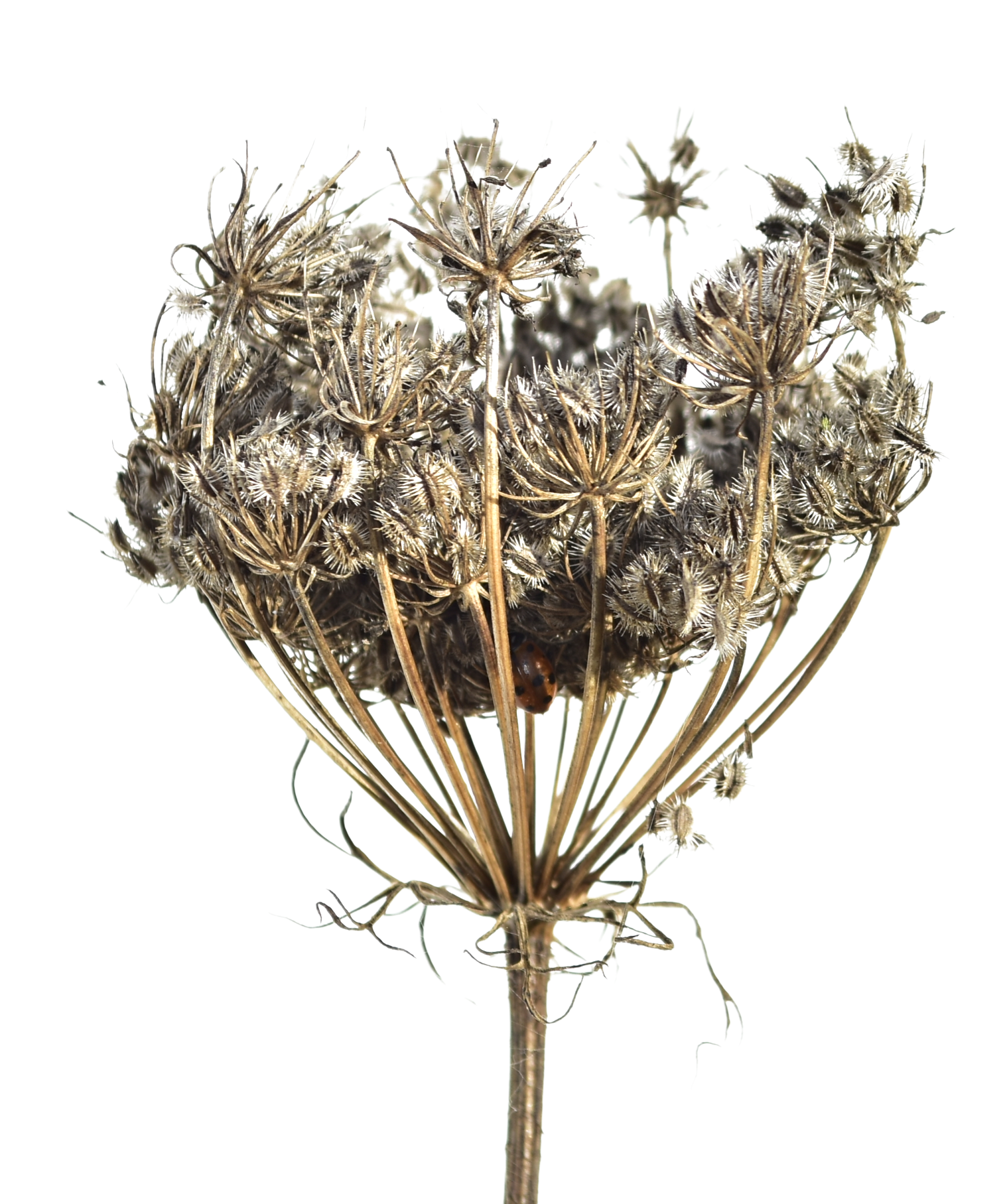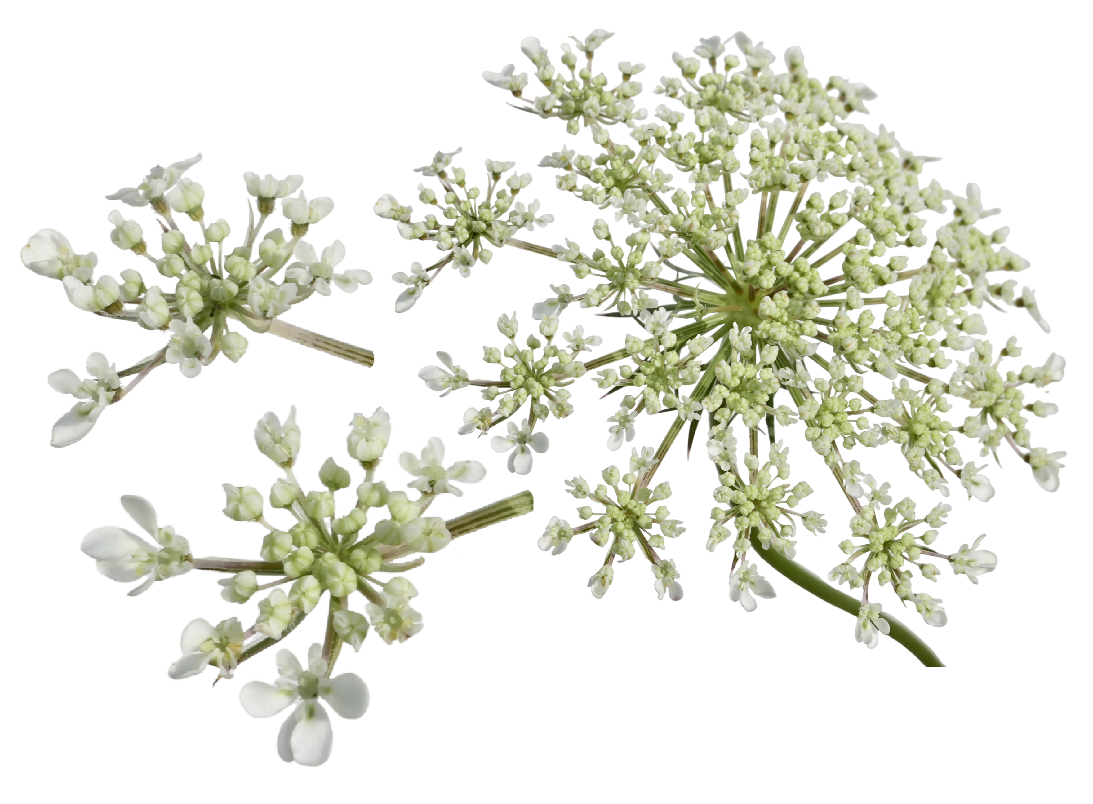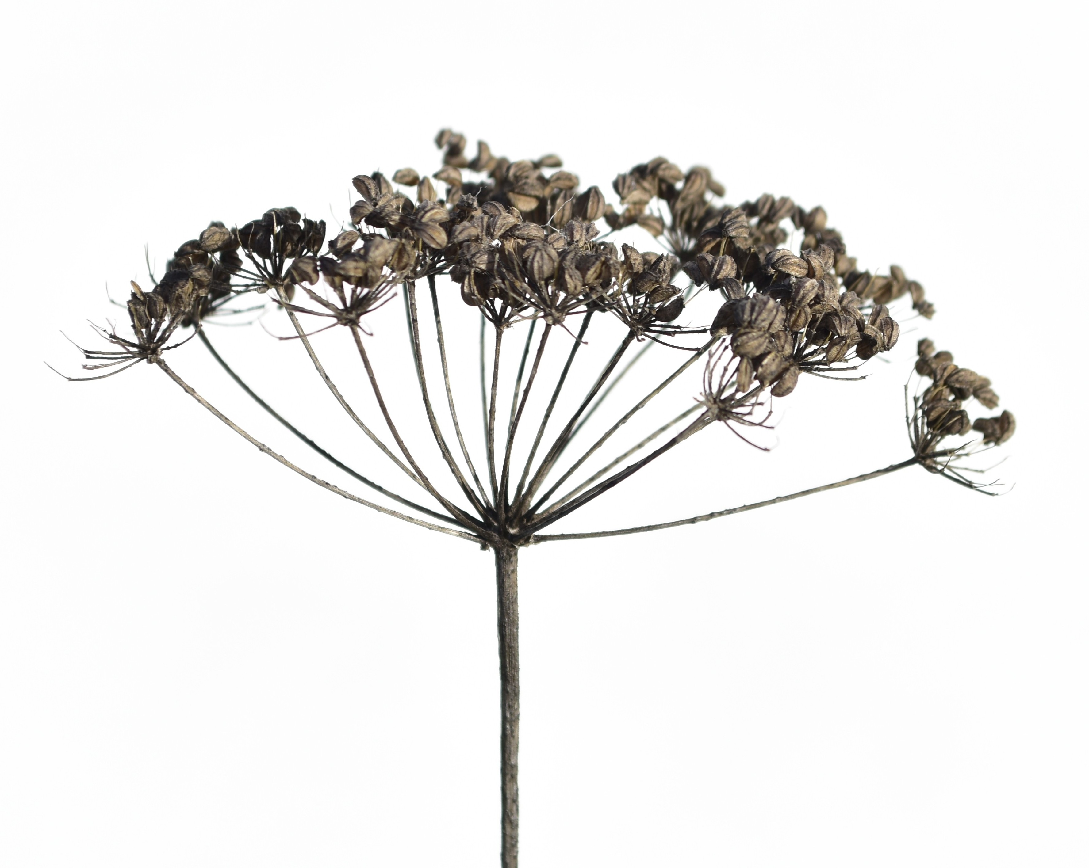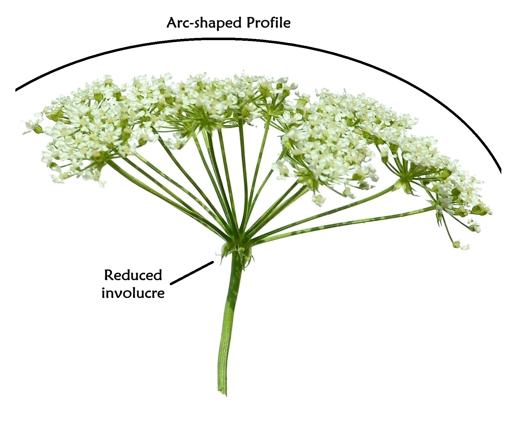 Borne off the main stem radiates many smaller stems (ray) from which an arrangement of flowering stems (umbellule) bears the individual florets. The umbellule looks like a smaller version of the whole umbel. The pedicel is the stem from which the individual florets sit. The above picture illustrates this example taken from a developing wild carrot flower.