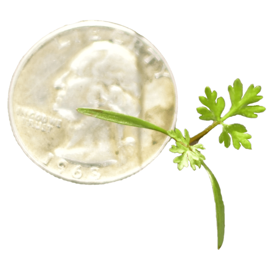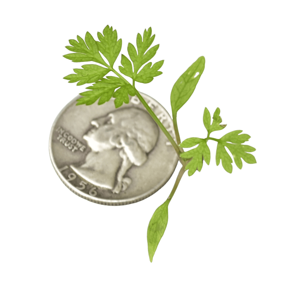 🥕 Wild Carrot leaves are long and slender and comparably much smaller. They are lacy in appearance, and the perimeter outline is somewhat spearhead in shape. The petiole is hairy, sometimes tinged red, never spotted. The petiole sheath is comparably smaller with no “collar” formation. Ultimate segments are curvy before terminating to a point. Entire leaf has fine hairs. Odor is herbal and carrot-like. Seedling’s cotyledons are long and narrow (narrow‑lanceolate).
