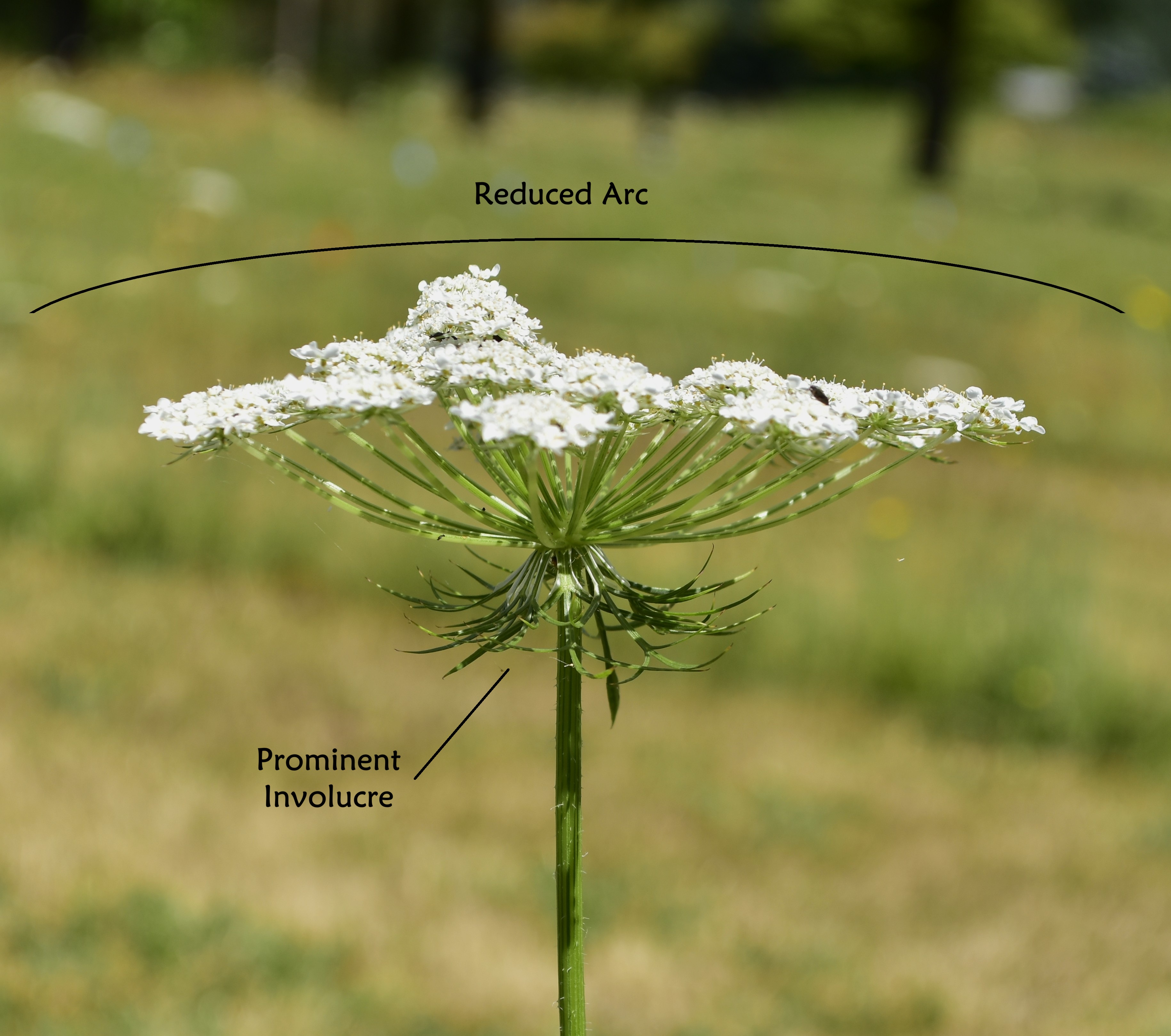 🥕 Wild Carrot has a very compact umbel, its profile is typically flat topped but can also be arced. It has a single purple floret in the center, and it has a prominent involucre. Complete inflorescence transforms into a “bird’s nest” shape during fruit production. Odor is floral and carrot-like. The dry, seed containing fruit are comparably thinner, display more pronounced vertical ridges, and are covered in stiff bristles.