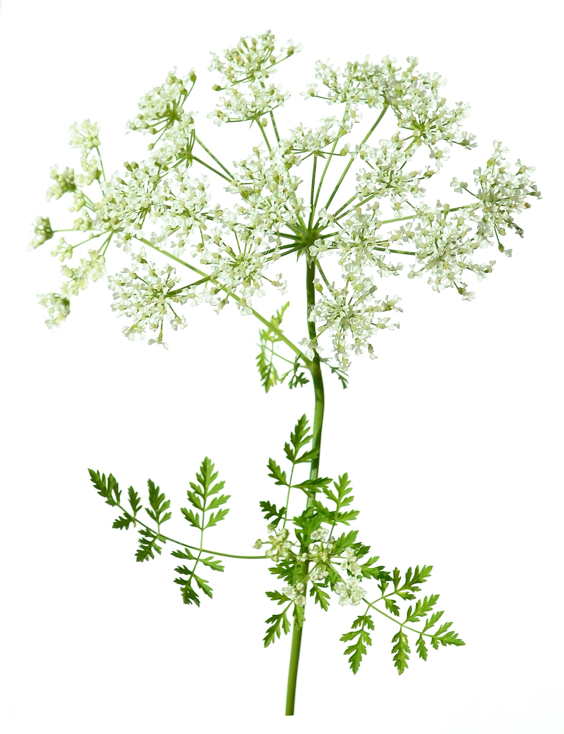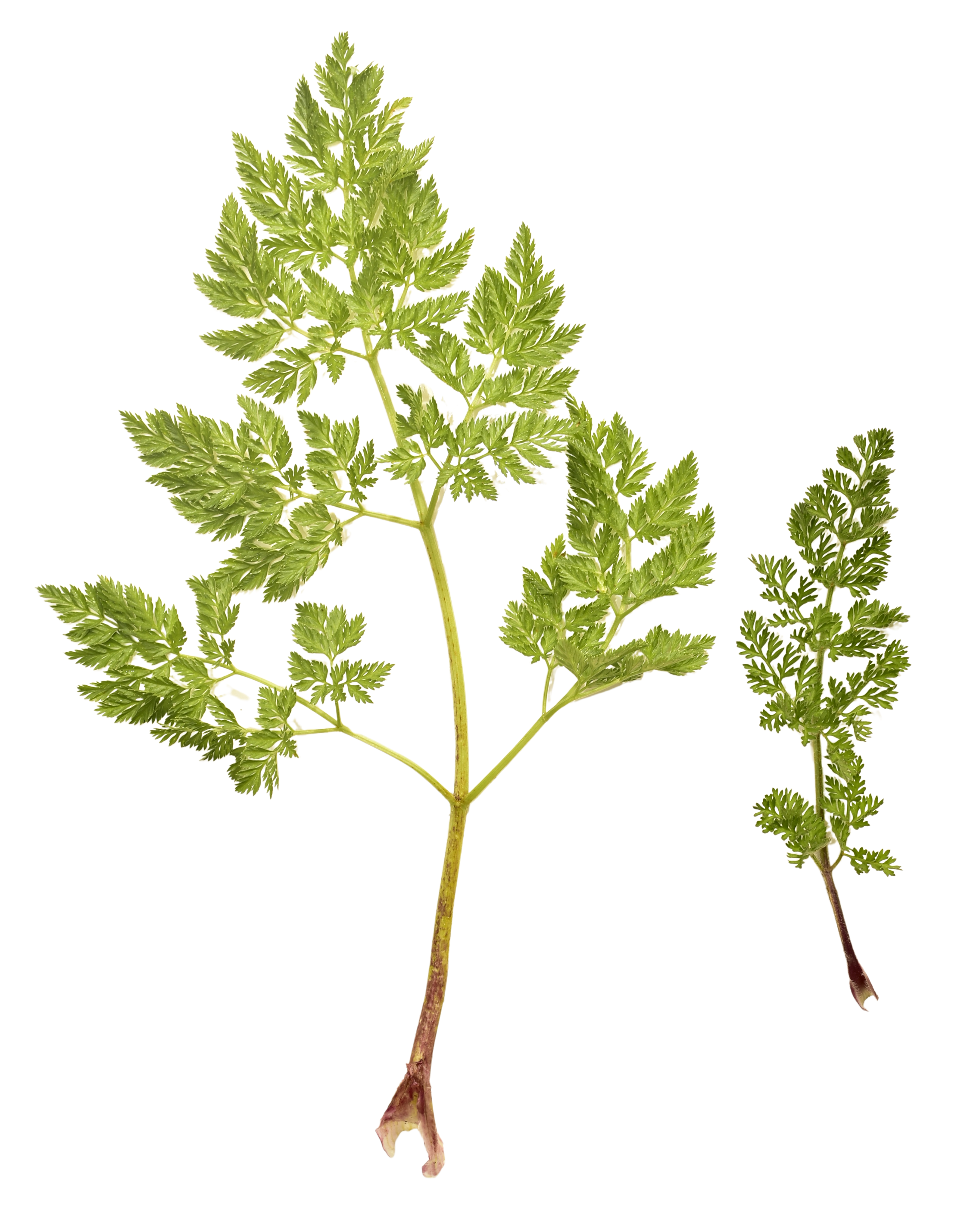 Both plants grow as biennials producing a large taproot and a basal rosette of leaves in the first year and developing flowering stalks in the second. Axillary branching emerges from the primary and sequential stems thereafter, each producing white-colored umbels. Leaves are decompound, feathery, and fernlike, arising in an alternate pattern. Both plants are entirely aromatic. Confusion between the two is most likely to occur early in their life cycle when both plants are near similar size.