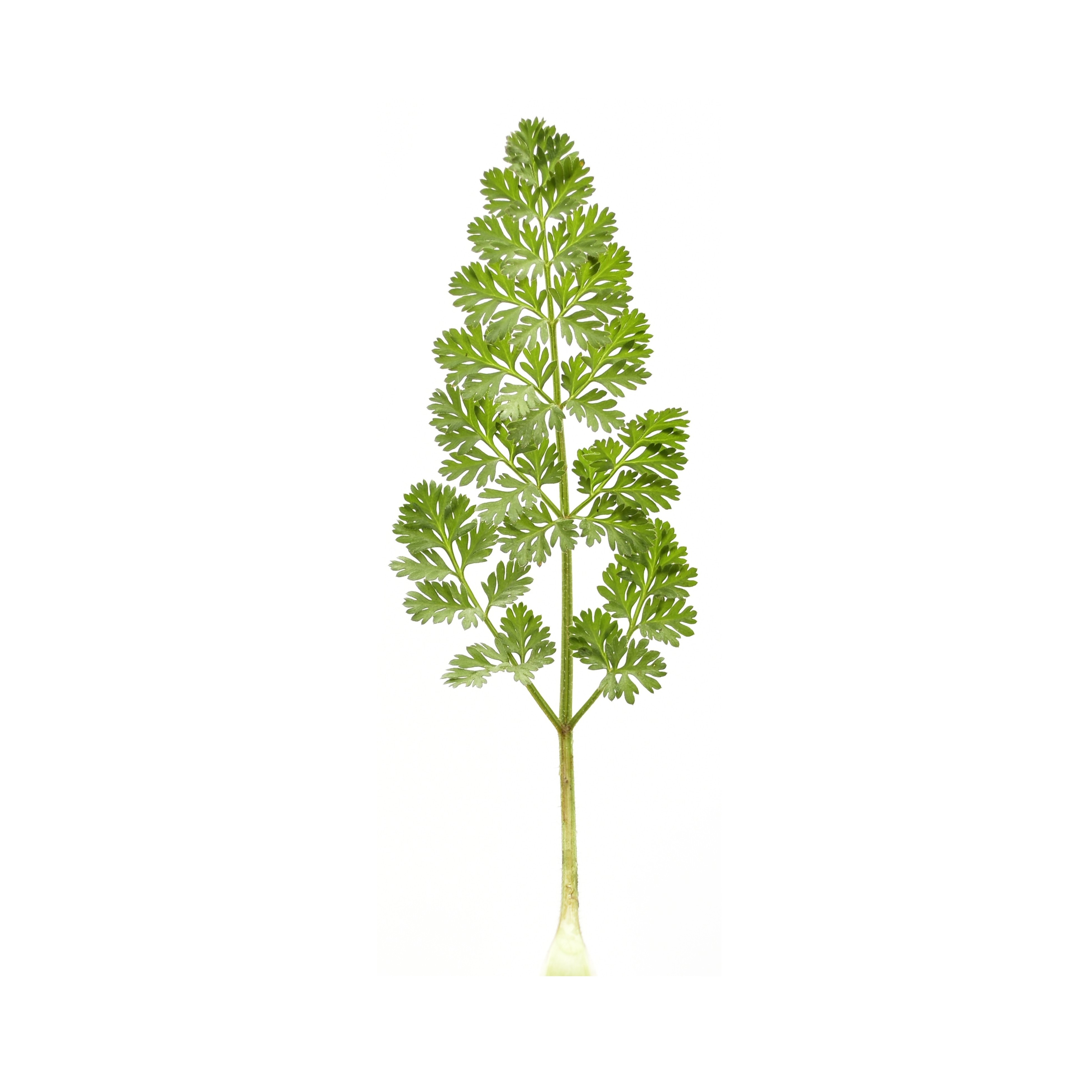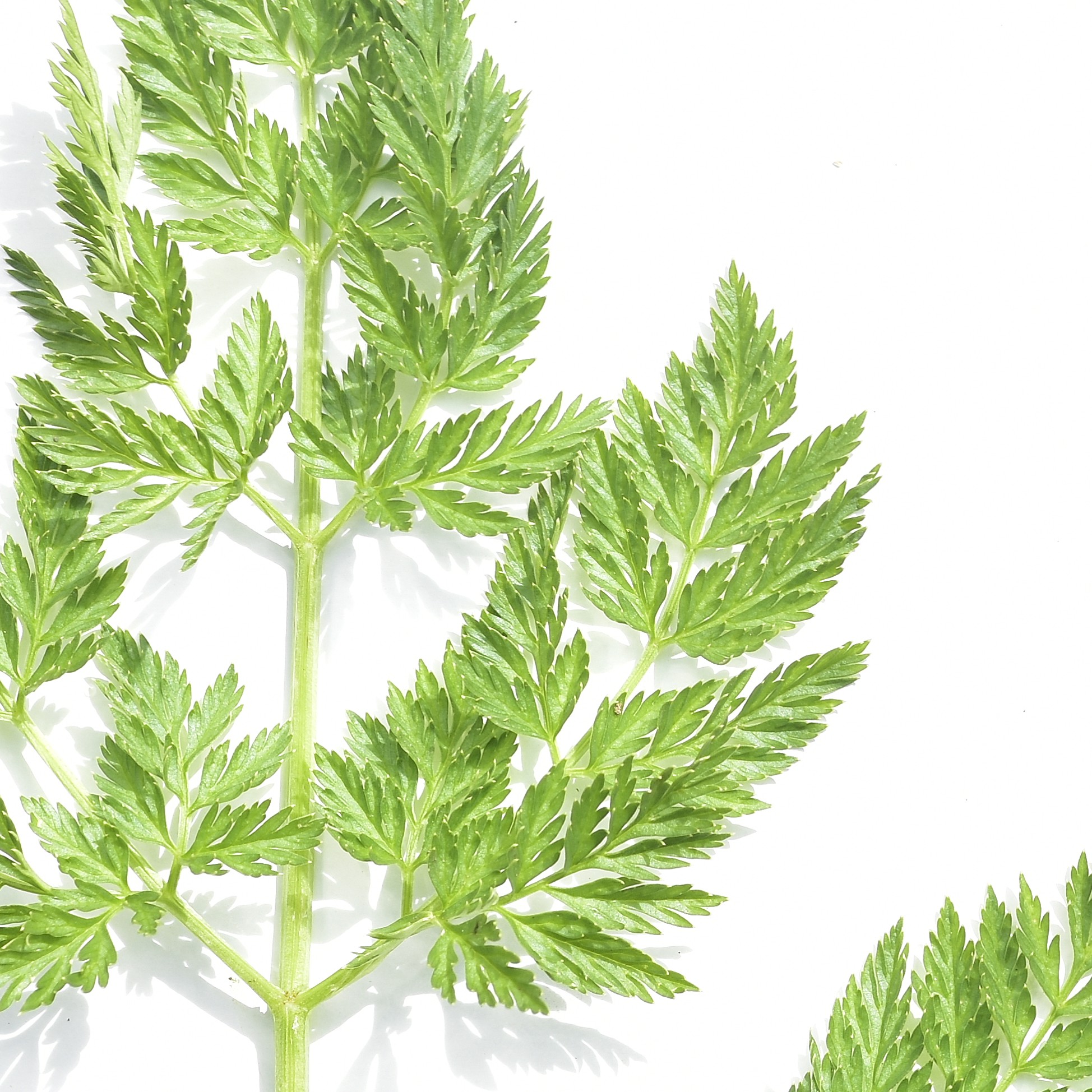 What appears as a stem with multiple leaves is in fact one single leaf. Imagine a broad leaf carved along its main, secondary, and tertiary veins until only a delicate lace of narrow segments remains—one continuous leaf that mimics many.