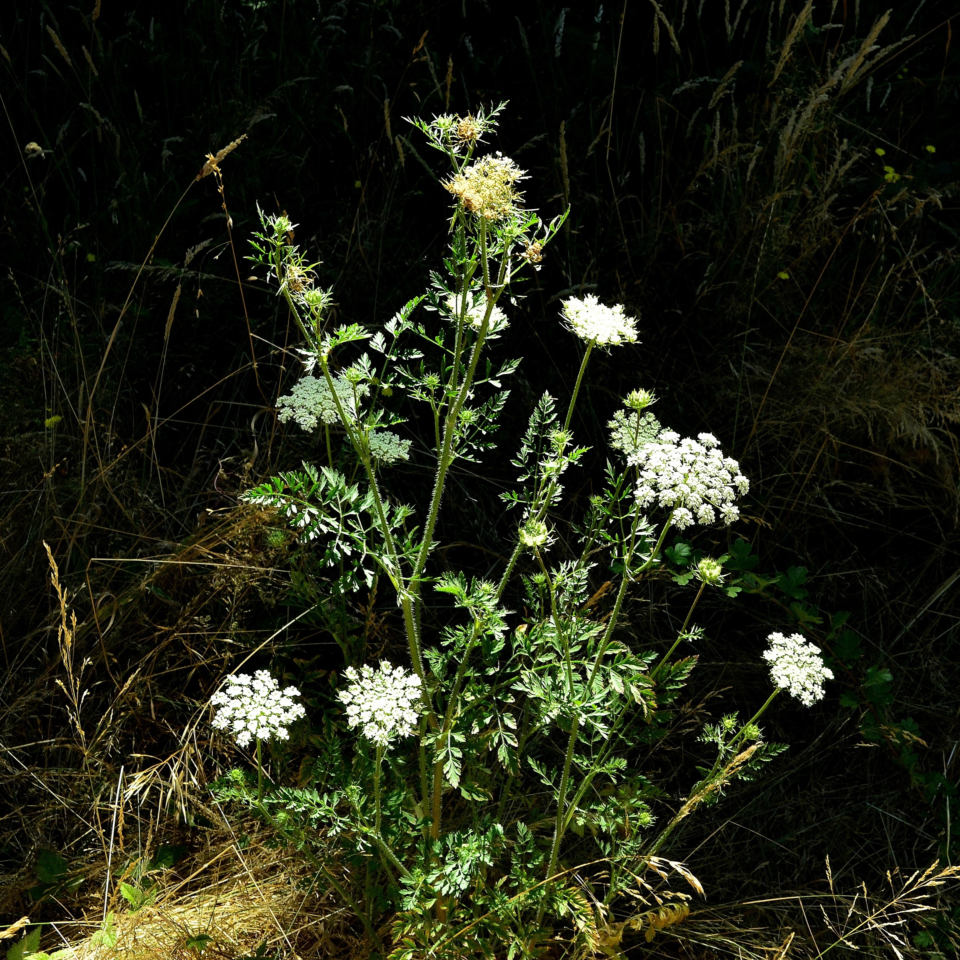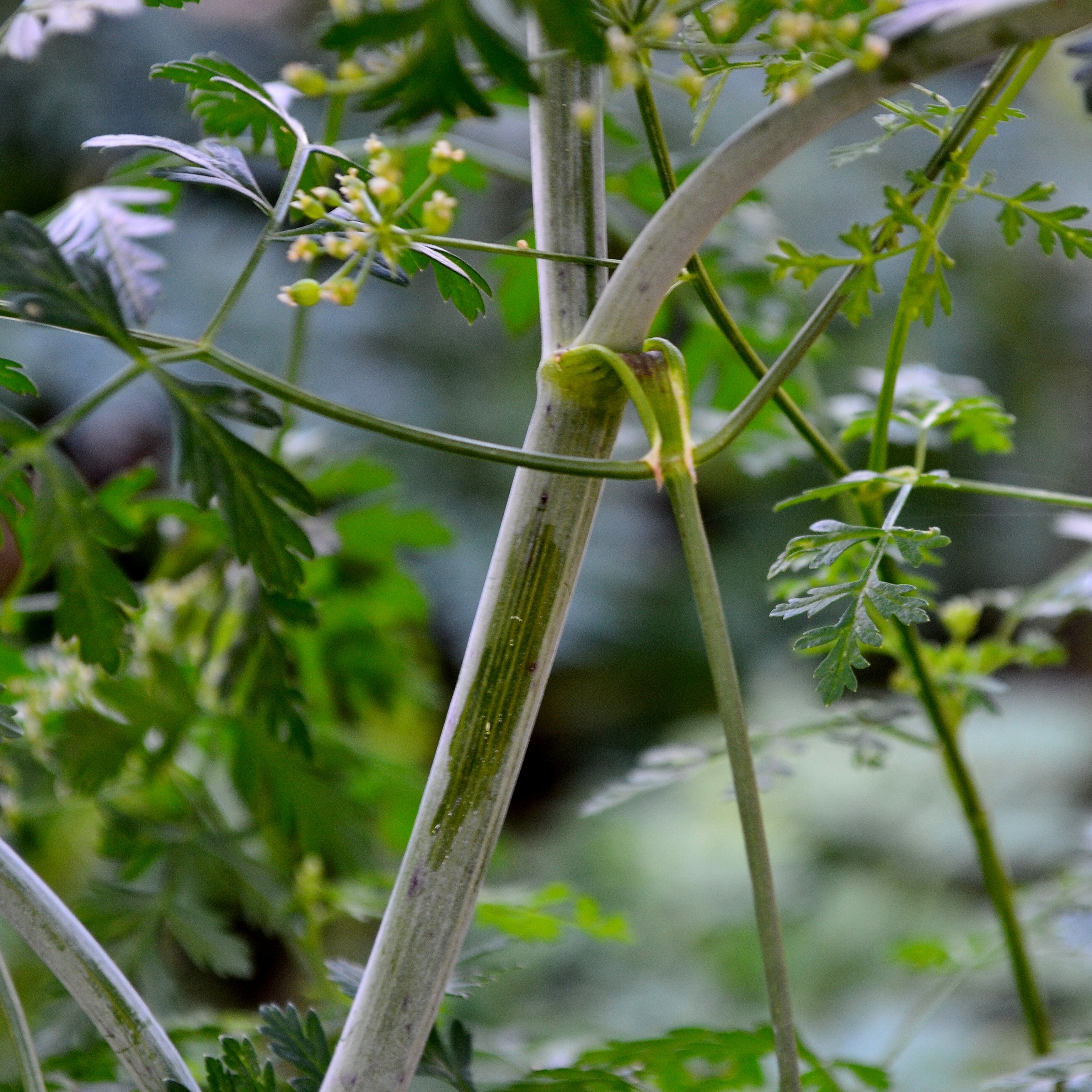 Specialized ducts store essential oils in various parts of each plant, and each genus has its own unique blend of terpenes and phenylpropanoids. Scents can range from sweet, licorice-like (anise, fennel) to minty (caraway, dill) to floral (carrot, coriander) to spicy (cumin). Poison Hemlock is described as having a pungent, musty, or mouse-like scent. Like many of the kitchen herbs we’re so familiar with, once a scent recognition is made, it’s unlikely to be forgotten.