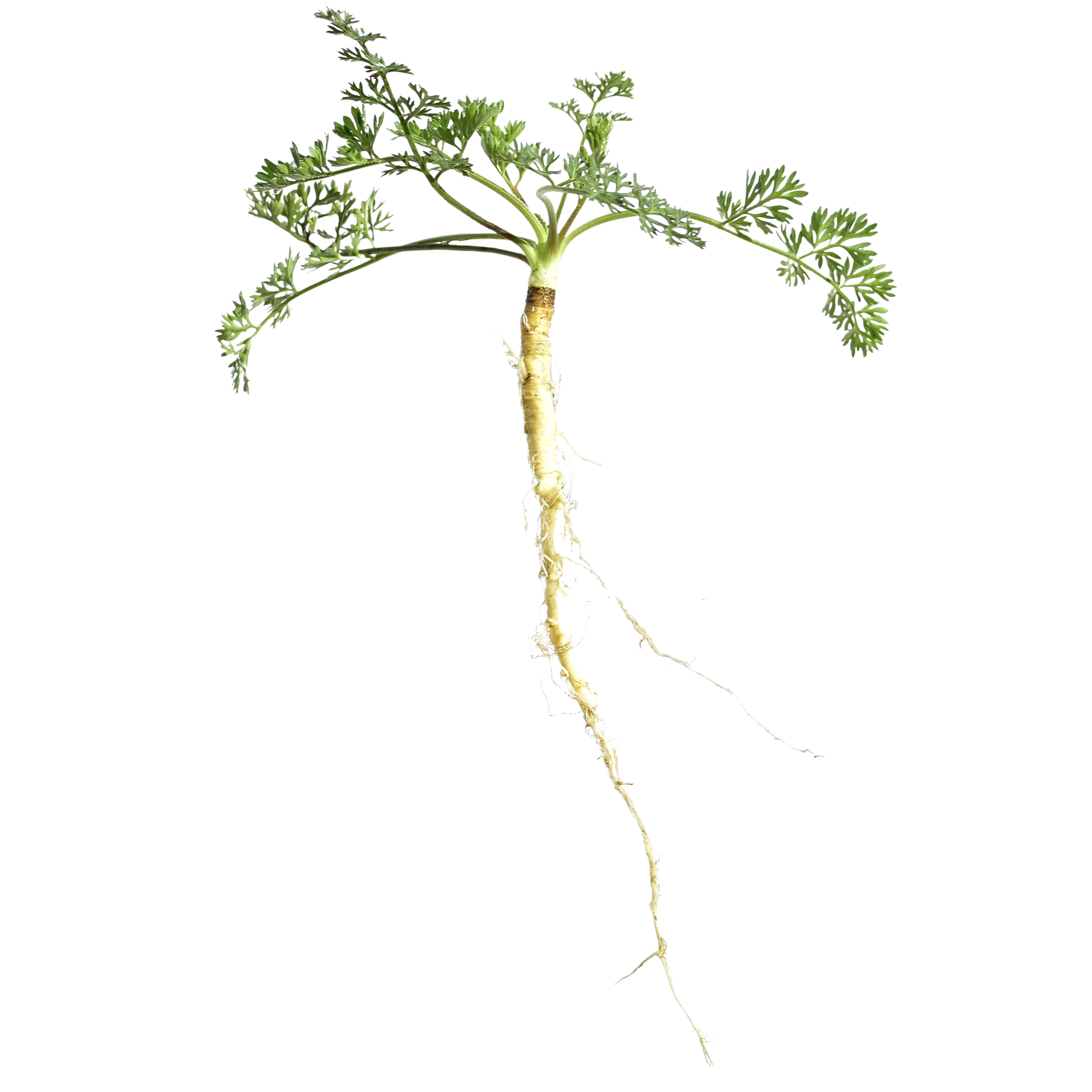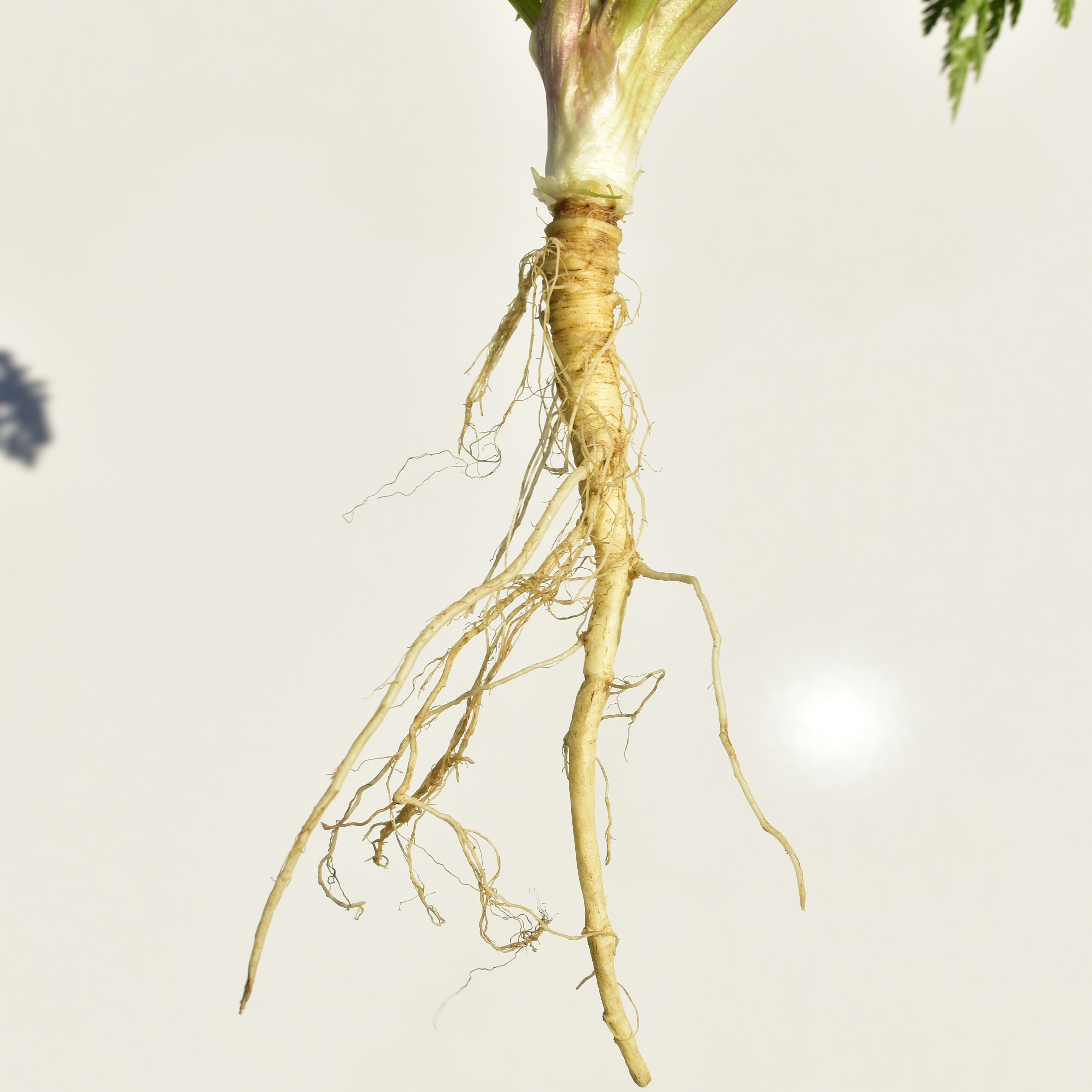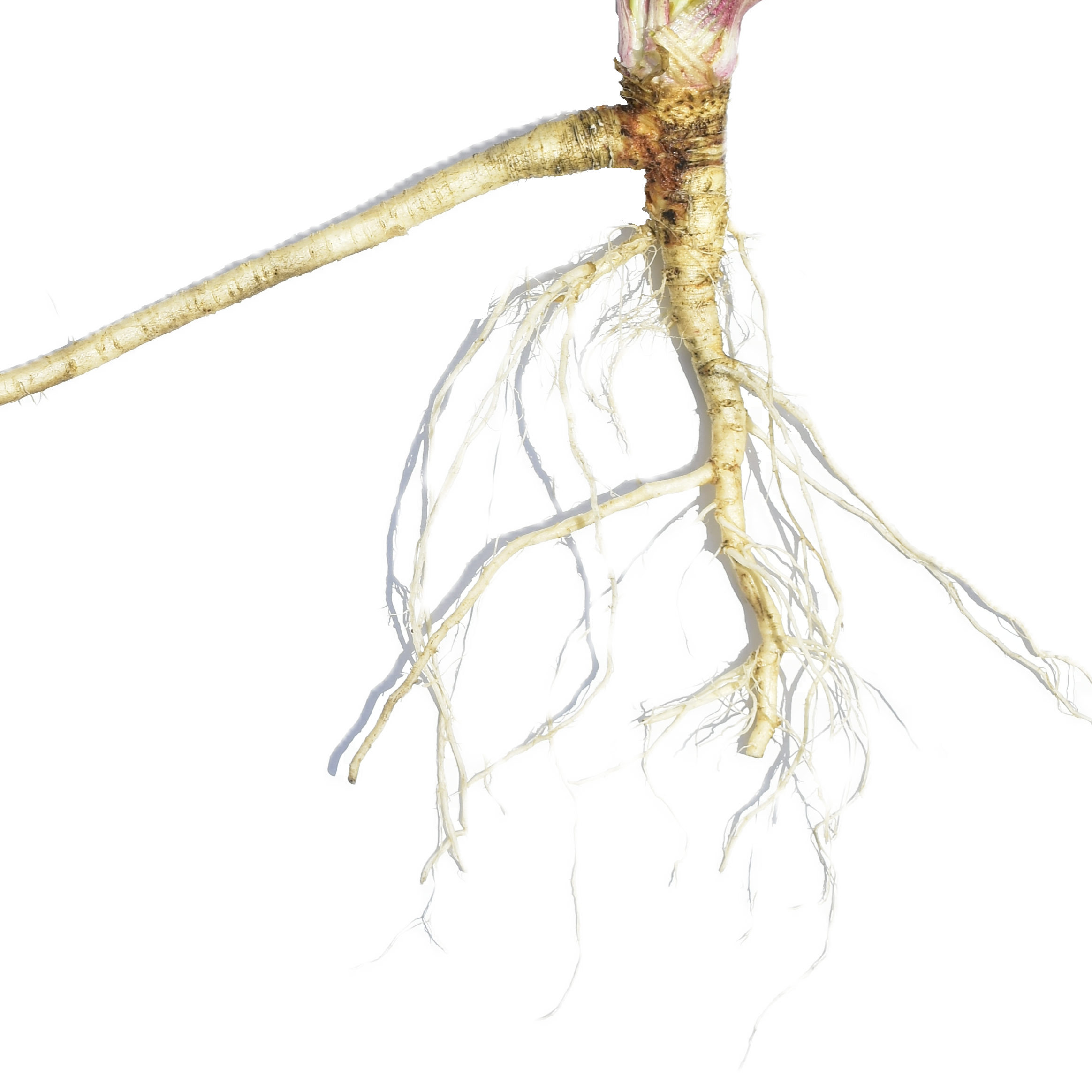 Similarity: Both produce a fleshy taproot with a ridged surface, often branching in rocky soil, with fine lateral roots, tan to off-white in color.