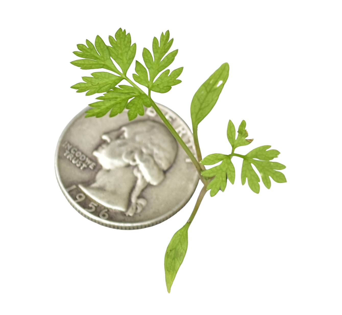 What appears as a stem with multiple leaves is in fact one single leaf. Imagine a broad leaf carved along its main, secondary, and tertiary veins until only a delicate lace of narrow segments remains—one continuous leaf that mimics many.