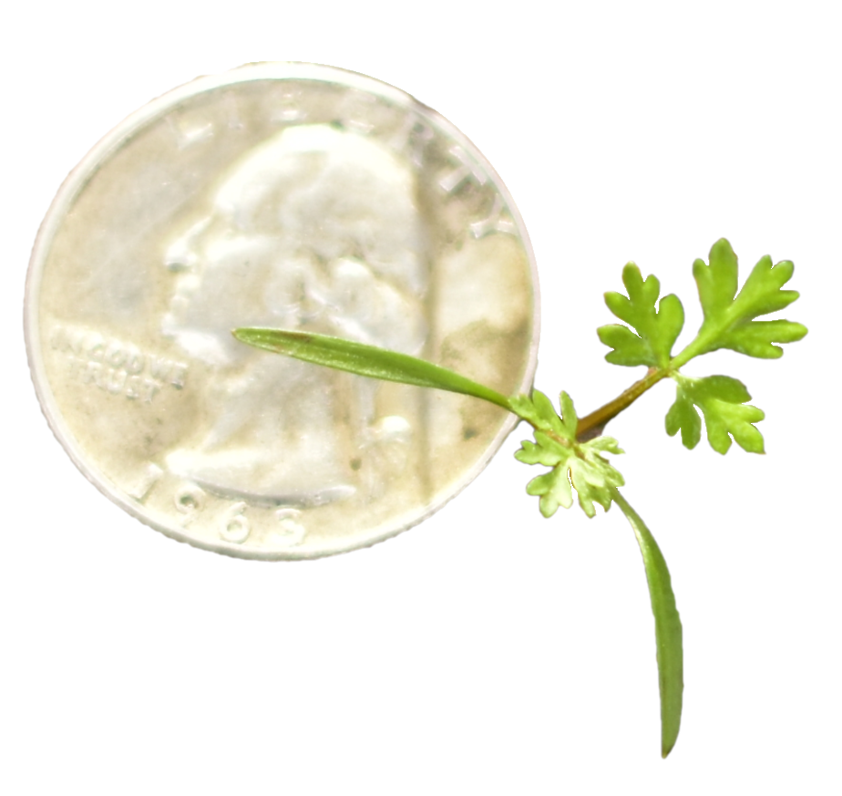 🥕 Wild Carrot leaves are long and slender and comparably much smaller. They are lacy in appearance, and the perimeter outline is somewhat spearhead in shape. The petiole is hairy, sometimes tinged red, never spotted. The petiole sheath is comparably smaller with no “collar” formation. Ultimate segments are curvy before terminating to a point. Entire leaf has fine hairs. Odor is herbal and carrot-like. Seedling’s cotyledons are long and narrow (narrow‑lanceolate).